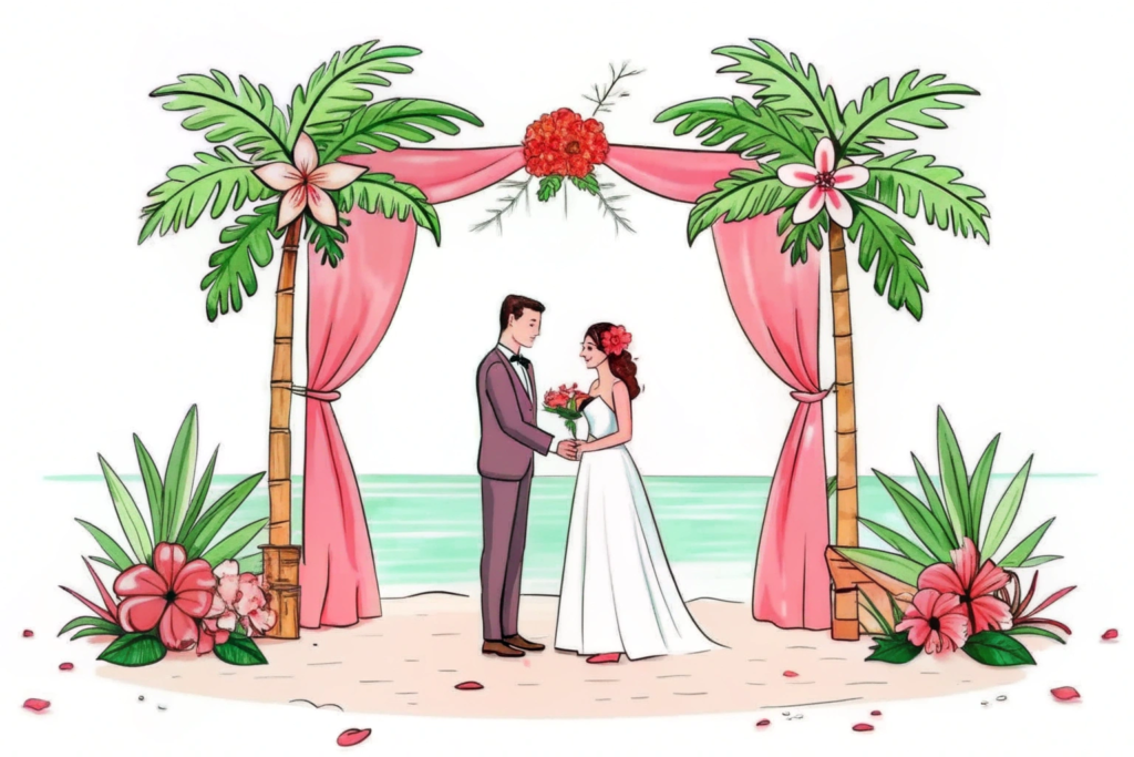- Plage et thème tropical : Décoration colorée, cocktails exotiques et palmiers pour un mariage décontracté en bord de mer.