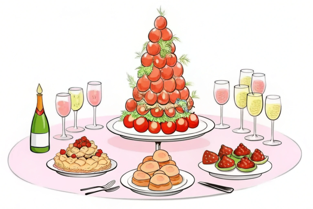 Un mariage en France ne serait pas complet sans la fameuse pièce montée, symbole de l’union des mariés. Le repas typique inclut souvent une entrée, un plat principal, un fromage, et un dessert, reflétant la richesse culinaire du pays.