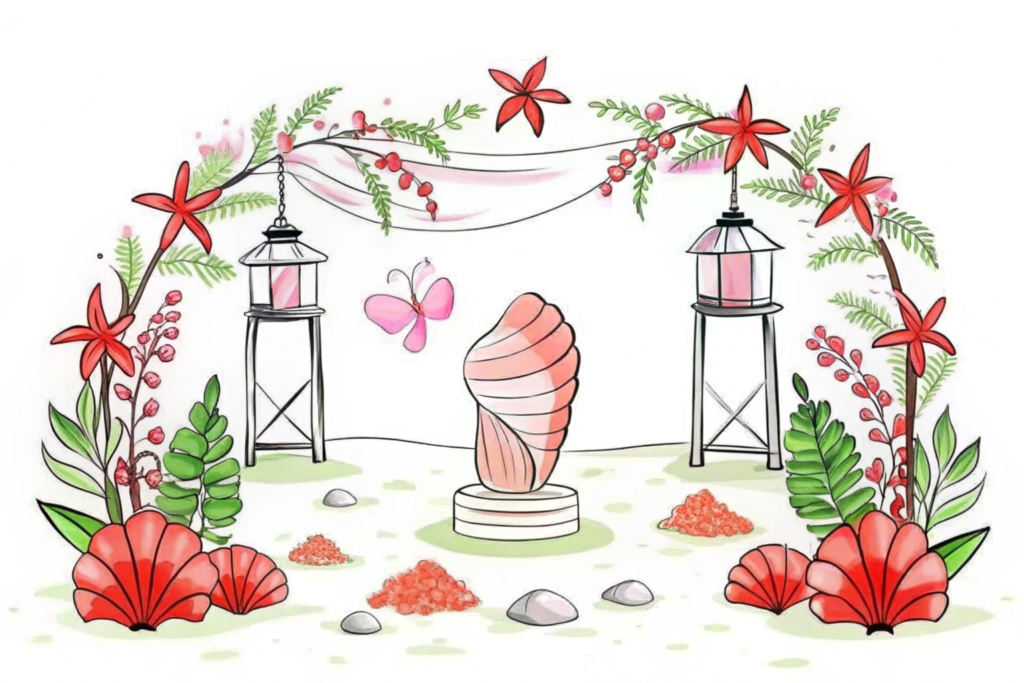 La disposition du lieu est essentielle pour le confort de vos invités. Prévoyez des chaises pliantes ou des coussins confortables pour que chacun puisse s’installer facilement sur le sable. Installez une arche de cérémonie qui servira de point central lors de l’échange des vœux. Pour une touche pratique, déroulez un tapis de sol qui guidera vos invités et facilitera leurs déplacements. N’oubliez pas de prévoir un espace ombragé pour protéger vos convives du soleil, surtout si votre cérémonie a lieu en plein après-midi.